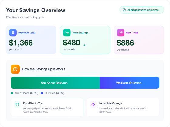 If we can’t secure any savings for you, you owe nothing. There are no upfront fees, no hidden charges, and no risks — we only get paid if we deliver real, verified savings.